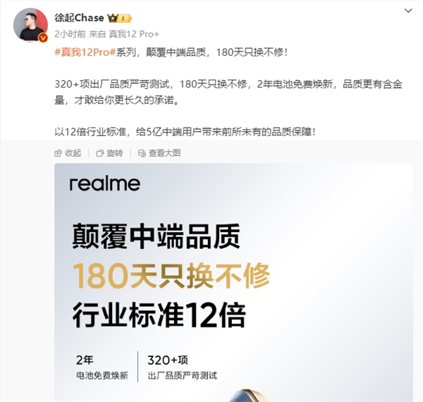 真我realme副总裁徐起发微博称,真我12Pro系列颠覆中端品质,经过了320多项出厂品质的严苛测试。