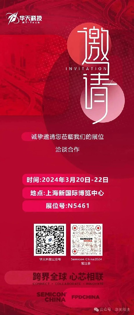 华天科技将于3月20日—3月22日(周三~周五)在上海新国际博览中心出席SEMICON China 2024展会,在此诚邀您莅临展位(展位号:N5461),并期待与业界专家交流市场商机,洽谈合作机会。
