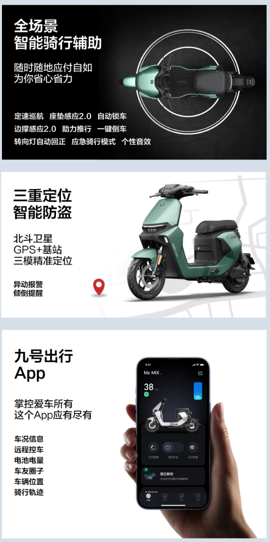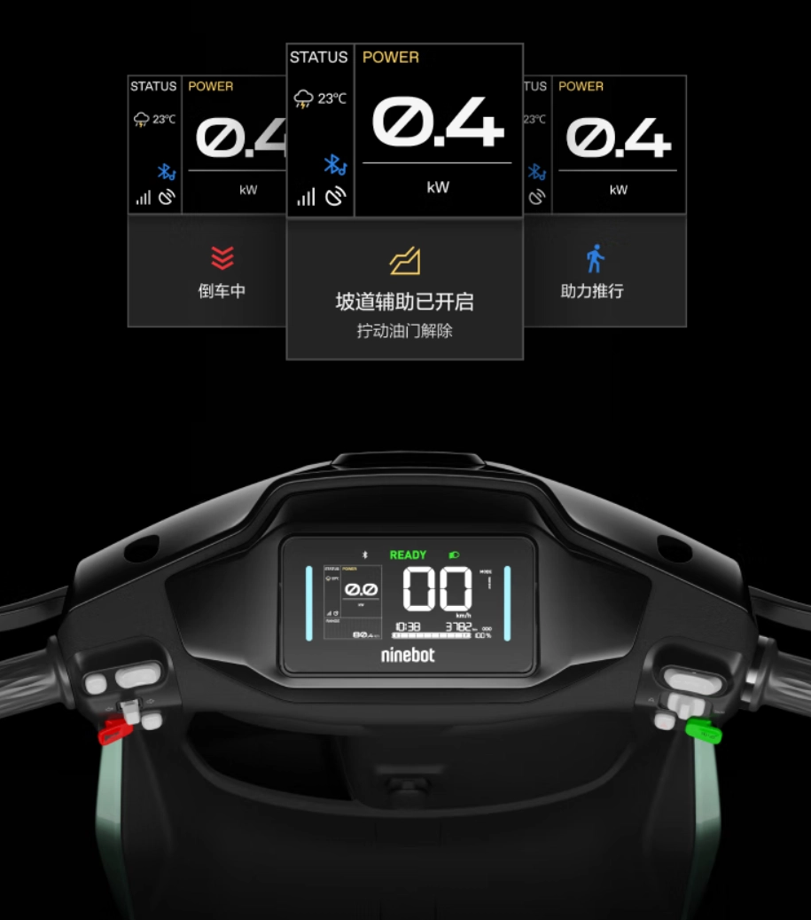 多项鼹鼠控功能,包括一键倒车、HHC 坡道驻车、TCS 牵引力控制、OTD 单转把模式;感应解锁 3.0,支持 NFC 解锁、App 解锁、蓝牙解锁、手表解锁、密码解锁、小程序解锁,后续可 OTA 升级更多功能。