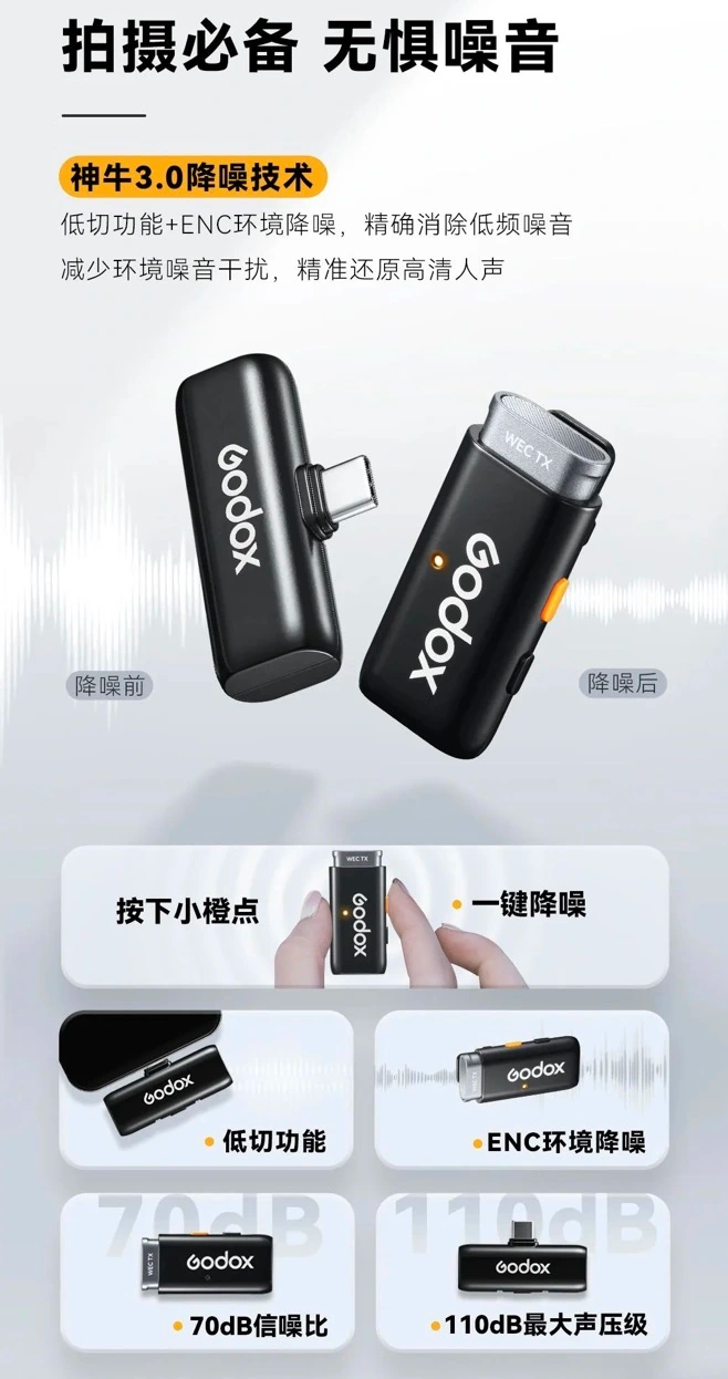 从官网看,神牛 WES 无线麦克风采用了 UAC 模式数字传输,支持 200 米范围内的稳定收音。同时 WES 无线麦克风还配备了降噪技术,拥有低切和 ENC 环境降噪功能,支持 70dB 信噪比,110dB 最大声压级,用户可通过接收器端的橙色按键实现一键降噪。