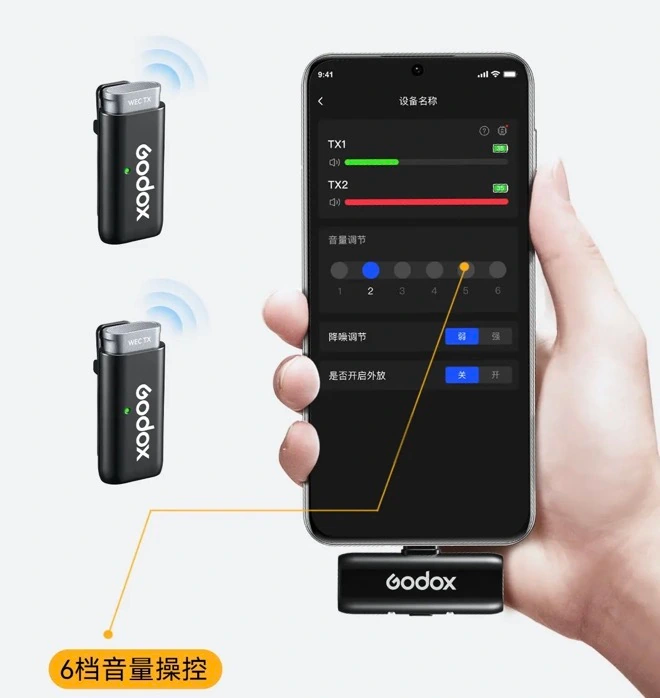 官方目前推出了产品专属 App“GODOX MIC”,用户可以通过官方 App 实时查看两个 TX 发射器当前电量,并实现六档音量调节、降噪、音量操控以及是否开启外放等功能。