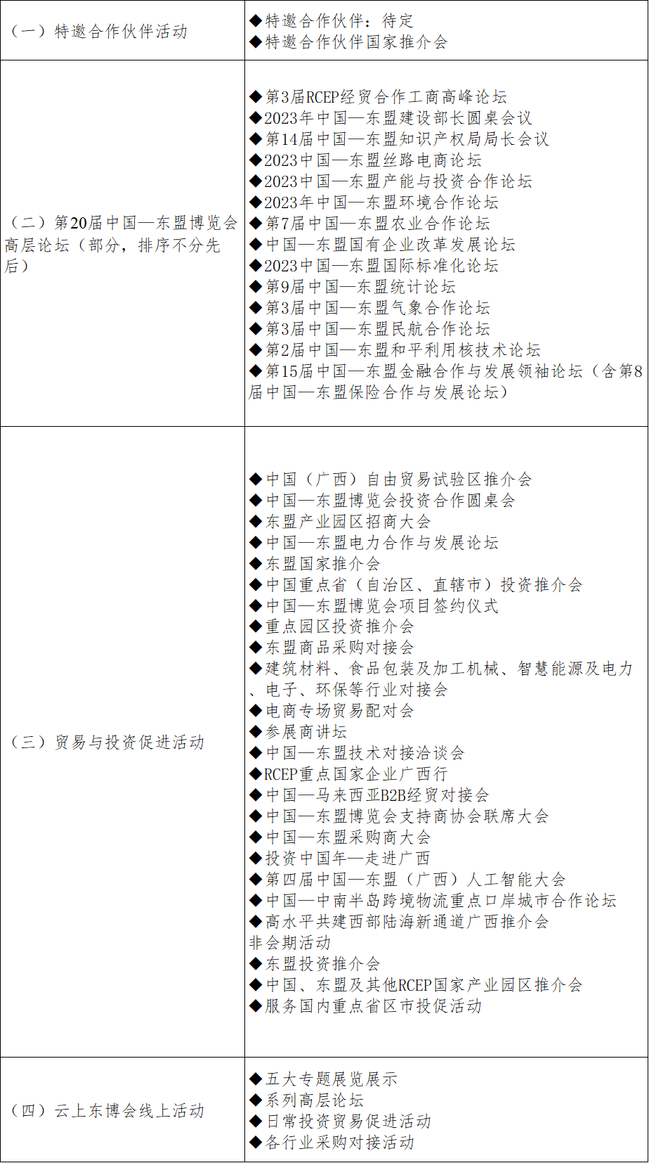 (注:部分论坛活动在第20届中国—东盟博览会会期以外举办。以上信息将动态更新,如有调整以中国—东盟博览会官网www.caexpo.org最新公布为准。)