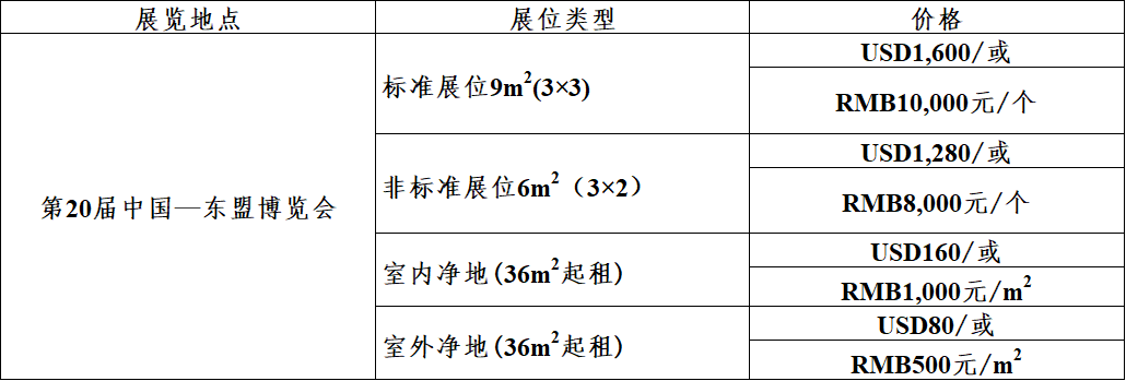 (注:1.标准展位及非标准展位配置:公司中英文楣板、围板、咨询桌1张、椅子2张、射灯2盏、500W单相插座1个、纸篓1个,铺设地毯;2.净地不含任何配置;3.展位搭建如需使用地图,请使用中国国家测绘局审定的标准地图,并提前1个月向中国—东盟博览会秘书处报审)