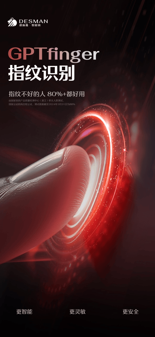 对此,德施曼领先全行业,全新发布GPTfinger,首次将GPT技术应用于智能锁指纹识别功能,引领智能锁行业进入GPT算法识别时代。